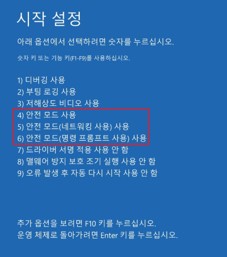 다시시작 - 4~6번 중 아무거나 선택하는 과정을 거치면 "안전모드"로 윈도우가 기동됩니다.